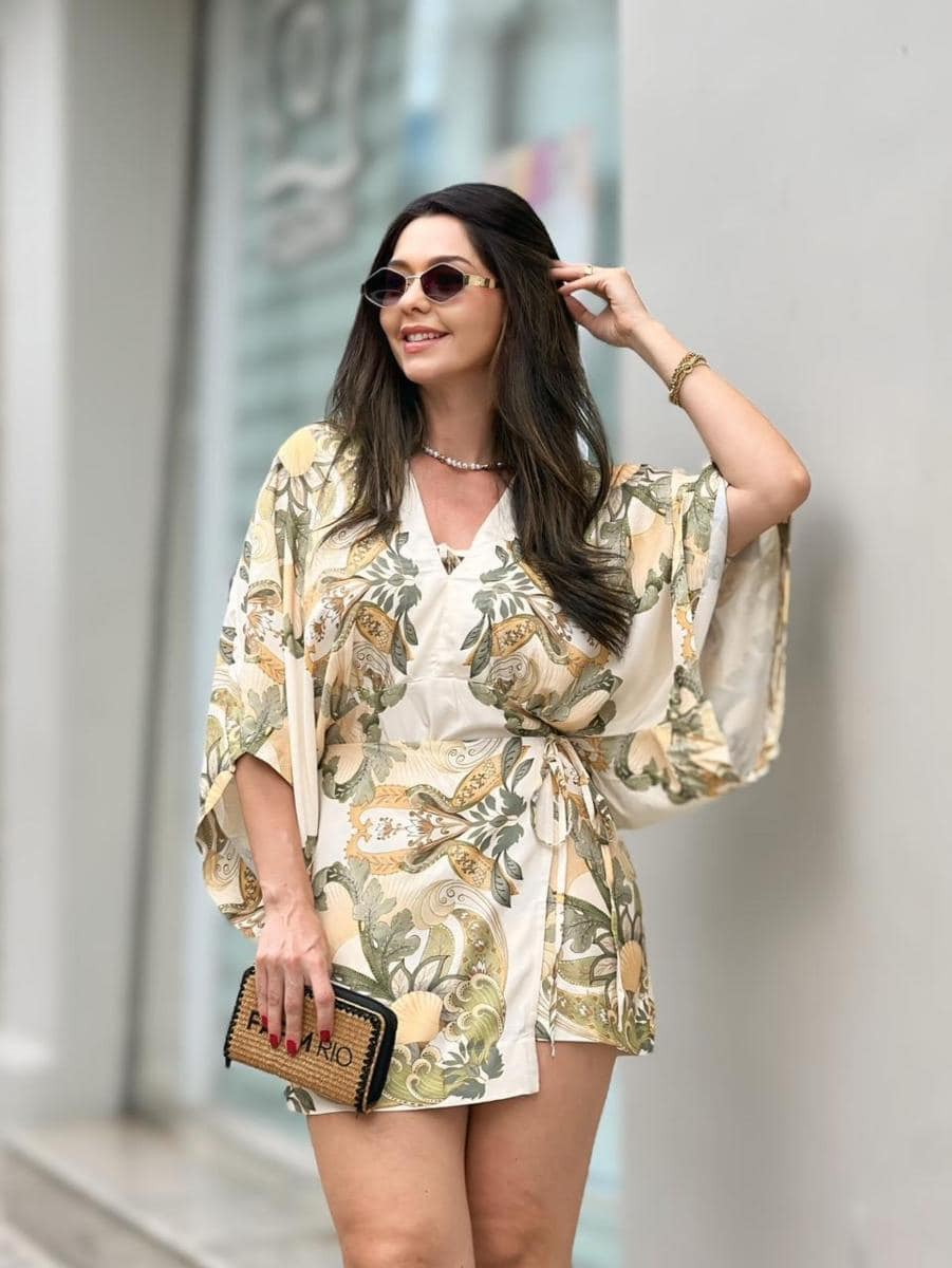 O Vestido Curto Farm Jardim de Mar Lenço é uma peça que combina a elegância do corte alfaiataria com a leveza da estética praiana. Ele apresenta um design estilo wrap (envelope) com amarração lateral, o que permite ajustar a cintura e valorizar a silhueta de forma natural.