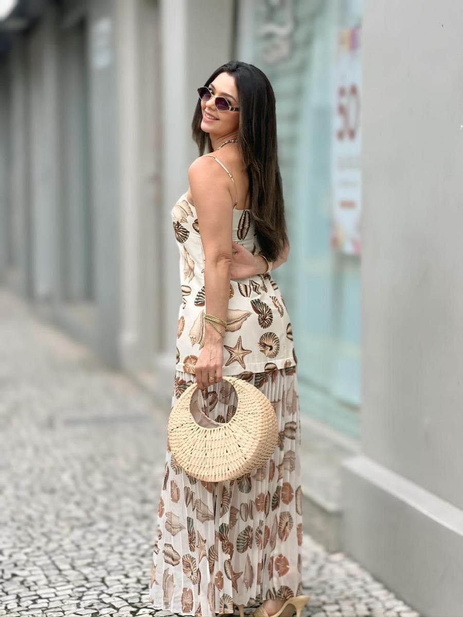 O Vestido Plissado Farm Conchas une sofisticação e frescor em um design marcante com estampa marinha exclusiva em tons terrosos. Possui decote reto, alças finas e uma saia plissada fluida que garante movimento e leveza. Com busto estruturado e modelagem ampla, é confeccionado em tecido leve, sendo a escolha ideal para eventos ao ar livre que pedem conforto e originalidade.